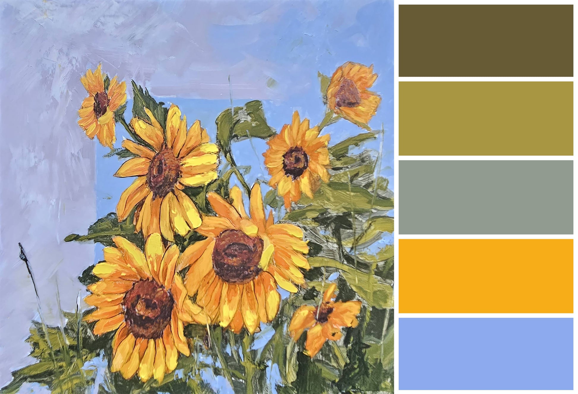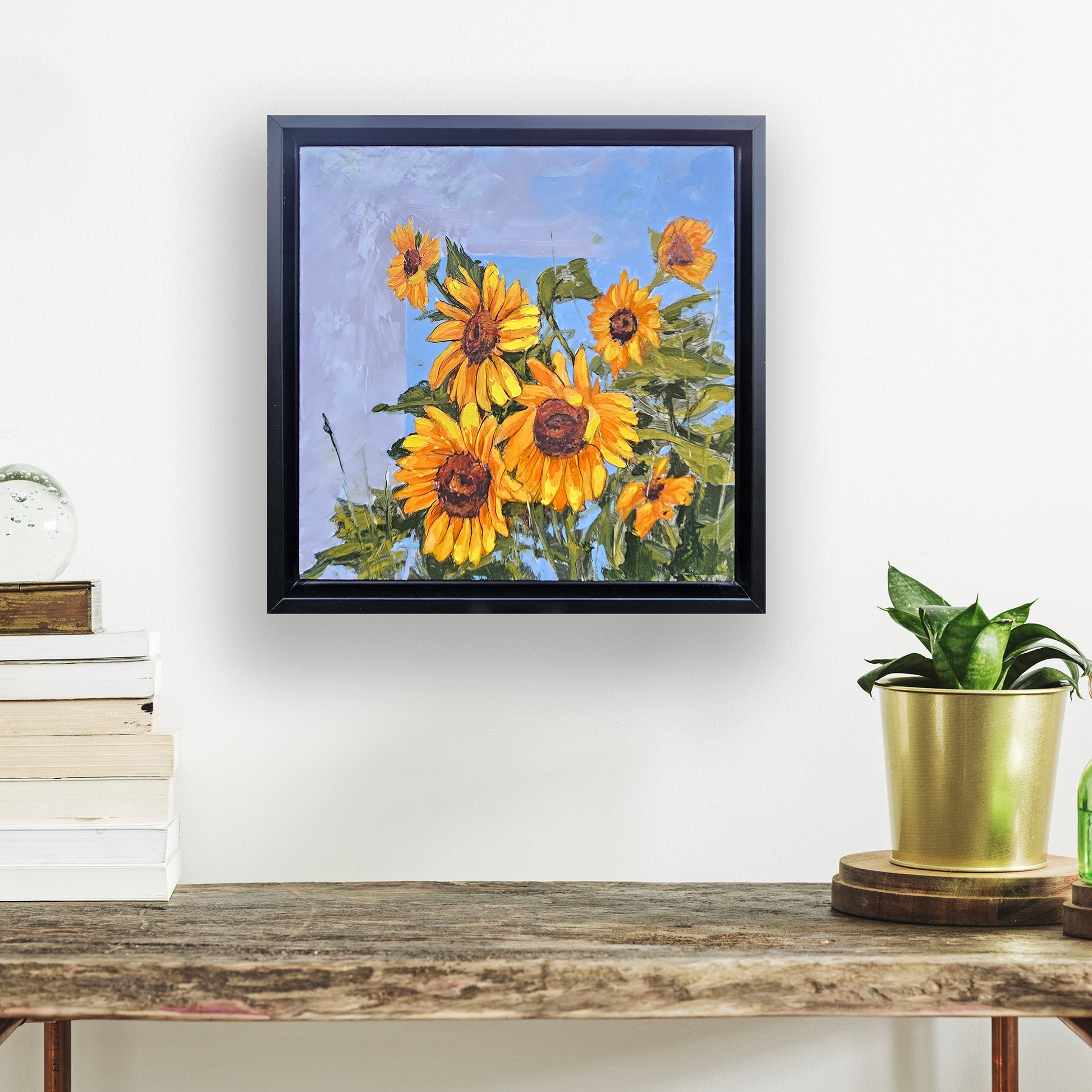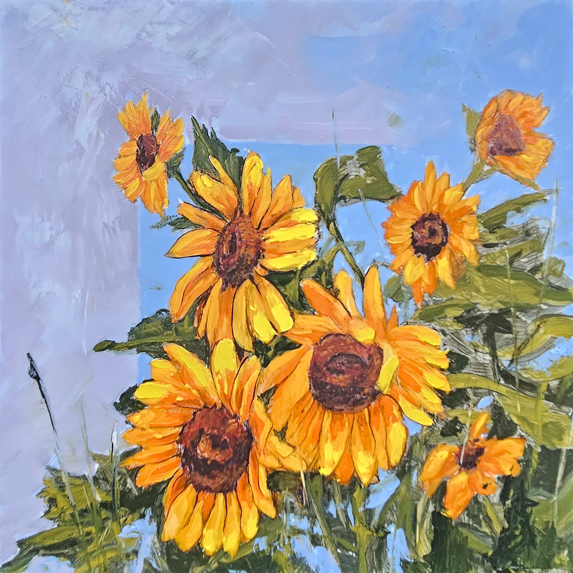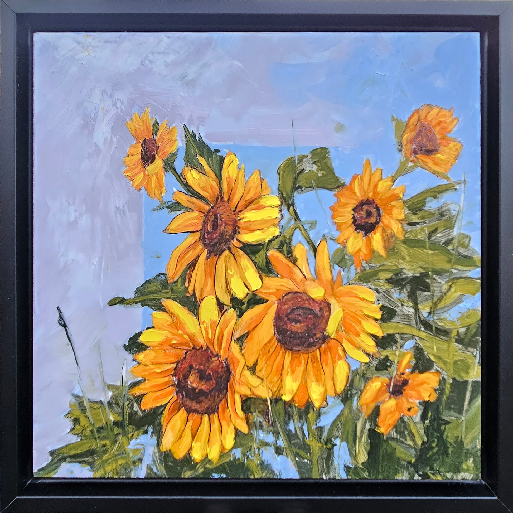 Bursting with light and life, this oil painting captures a jubilant bouquet of sunflowers reaching skyward, their golden faces turned toward the sun as if in silent devotion. Each petal shimmers with warmth, layered in thick, expressive brushstrokes that seem to breathe with the rhythm of the summer breeze. Against a backdrop of soft, shifting blues and wisps of cloud, the blooms radiate an energy that feels both earthly and divine—a celebration of resilience, renewal, and the simple miracle of growth. The composition invites the viewer to stand beneath the towering stalks, to feel the sun’s heat and the quiet joy of nature in full bloom.